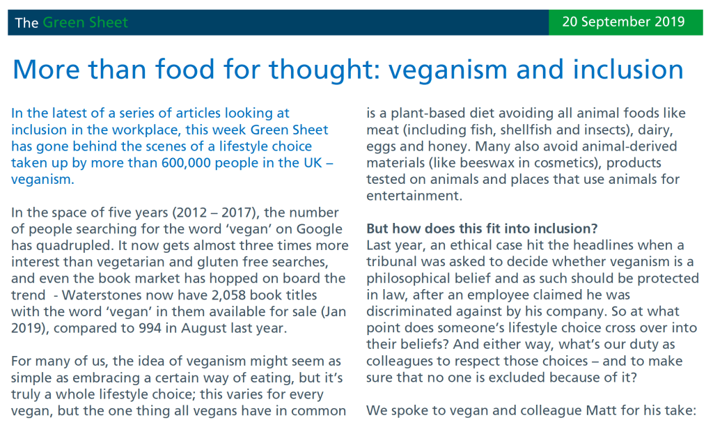 We’re really proud of Matt for speaking up and sharing what it means to be vegan and how we can be more inclusive of people’s lifestyle choices in the workplace, and wanted to feature it here for all of our members to see.