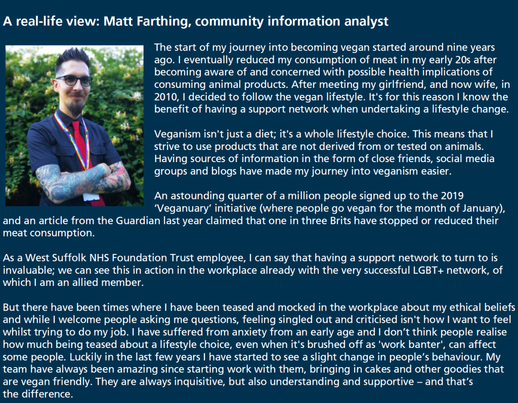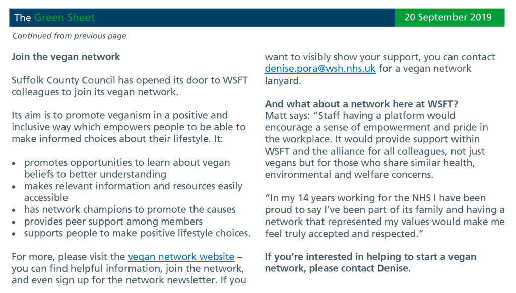 As you no doubt already know, the Vegan Network is open to Suffolk County Council staff and it’s partners. We’re very lucky to have some great links with West Suffolk NHS Foundation Trust, and one of our members there was recently interviewed for their staff communication update.